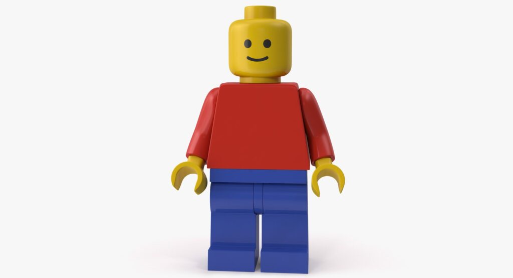 「レゴ風の全身立ち絵。写真のポーズを模倣。ブロック状の腕と脚、鮮やかな色。影は最小限。白背景。足元にうっすら落ち影。」