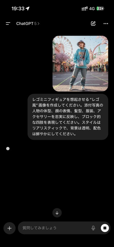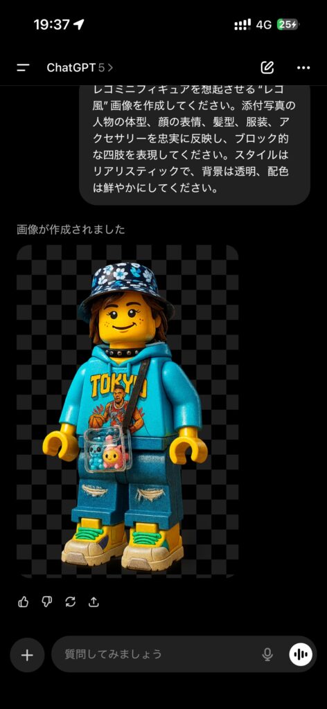 自分の写真1枚と以下のプロンプトをChatGPTに入力するだけで、自分そっくりのレゴ風キャラクターを作成できます!