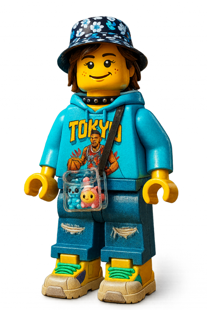 「レゴ風全身。写真中の[バッグ/帽子/メガネ]を必ず描写して大きめに。色と形を忠実に。背景は単色パステル。」