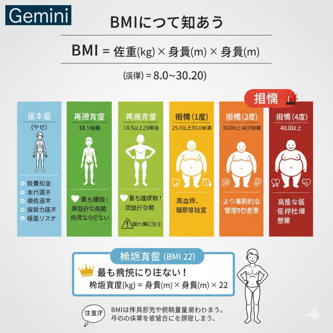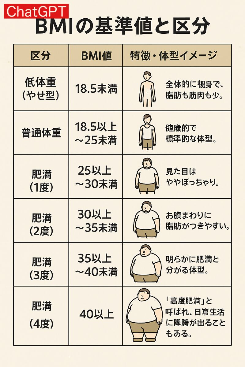プロンプト①:BMIの基準数値とそれぞれの区分ごとの特徴、どのような体型かをおしえてください。