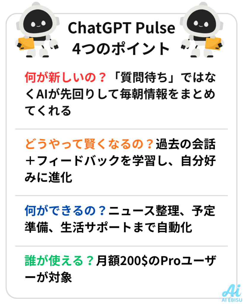 これまでのChatGPTは、ユーザーが質問しない限り動かない“受け身のAI”でした。Pulseはそこから進化し、次のような特徴を備えています。