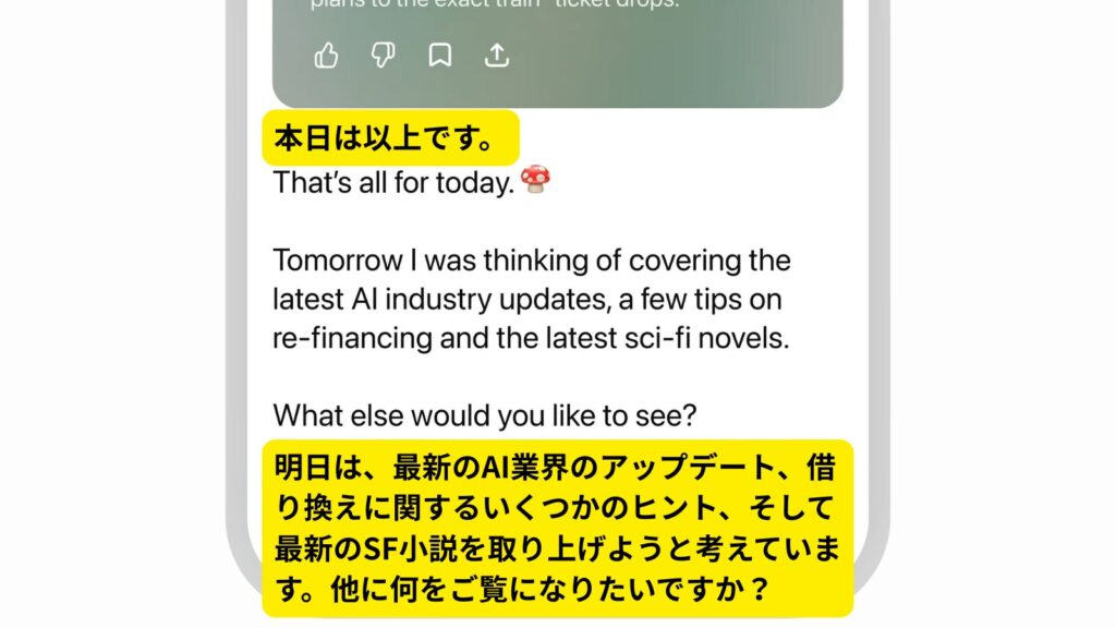 過去のチャット内容を踏まえて、関連する情報を提示します。たとえば、以前に「家庭菜園」について質問していれば、翌朝には季節に合った栽培ヒントを届けてくれるといった具合です。 - フィードバックで進化