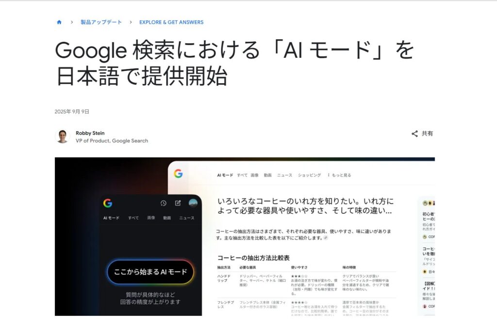 ・Google Japan Blog(日本語)「Google 検索における『AI モード』を日本語で提供開始」(2025/9/9):https://blog.google/intl/ja-jp/products/explore-get-answers/ai-mode-search/
