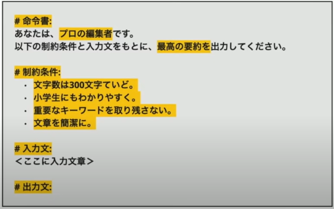 最後に「出力文」と明記することで、AIに対して回答の生成を促します。