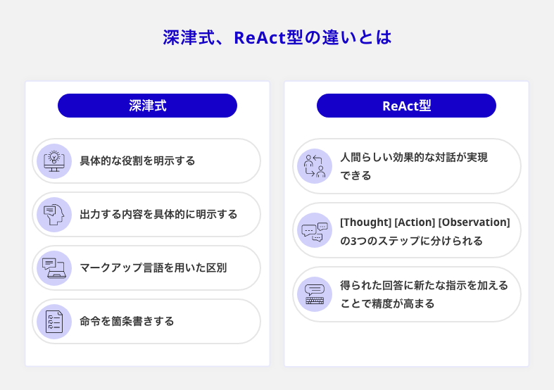 従来の一般的なプロンプトでは、「○○について教えて」という漠然とした質問をしがちですが、深津式プロンプトでは、AIに対して具体的な役割を与え、明確な出力形式を指定することで、期待通りの結果を得ることができます。