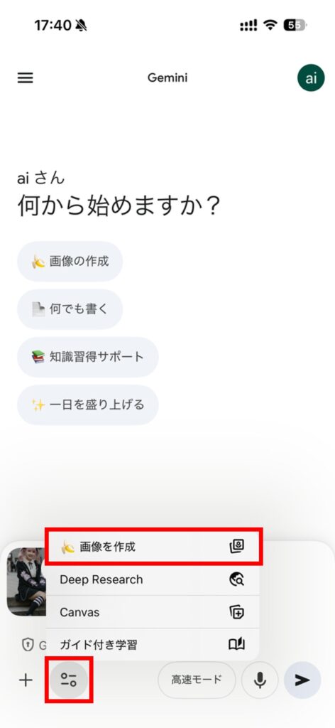 - チャット入力欄下部の「🍌画像」ボタンをタップ