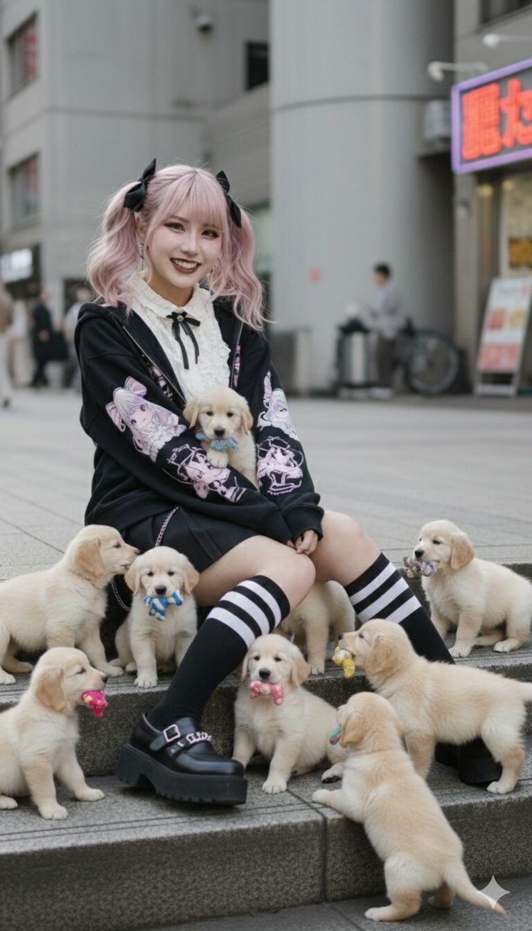 この意味が転じて、AI画像生成のトレンド「Puppy Love」では、たくさんの子犬に囲まれて幸せそうな瞬間を作ることで、無垢さ・愛らしさ・癒しといったイメージを強く演出しています。
