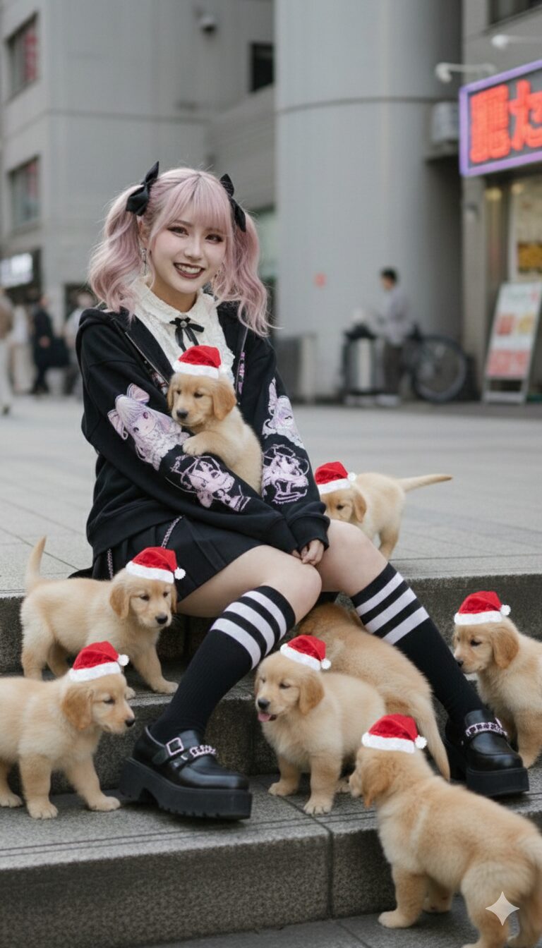 添付された写真をベースに、サンタの帽子を被った同じ犬種・同じ月齢の小犬を8匹ほど追加してください。被写体の足元から周囲に自然に散らばるように配置し、1~2匹は私の膝の上に登っています。実際の環境光に合わせて影と質感を統合してください。犬種は「ゴールデンレトリバー」お願いします。元の写真の人物・背景は一切変更せず、子犬のみを追加してください。