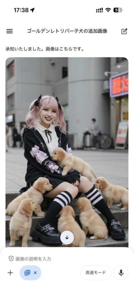 添付された写真をベースに、同じ犬種・同じ月齢の小犬を8匹ほど追加してください。被写体の足元から周囲に自然に散らばるように配置し、1~2匹は私の膝の上に登っています。実際の環境光に合わせて影と質感を統合してください。犬種は「ゴールデンレトリバー」でお願いします。元の写真の人物・背景は一切変更せず、子犬のみを追加してください。