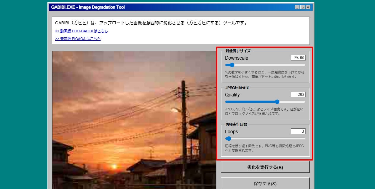 「画像リサイズ」「JPEG圧縮強度」「再帰実行回数」を調整することで、ガビガビ感の調整が可能!