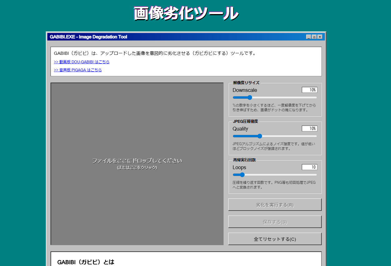 意図的に画像を劣化させるツール「GABIBI (ガビビ)」を公開しました。ネットに漂う古のJPEG画像を再現できます。 https://t.co/wv0LlCabBK pic.twitter.com/8CjDtmYHgj