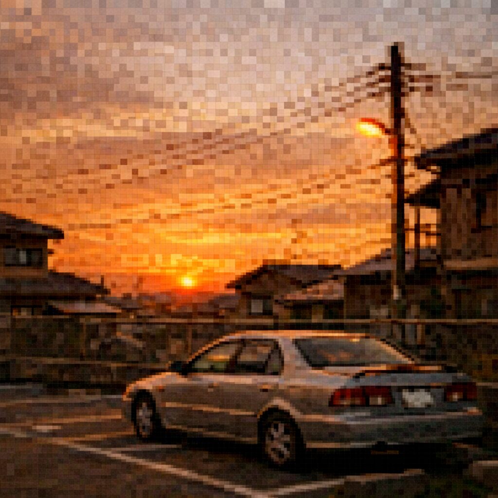 image resized down to 64×64 pixels then enlarged back to high resolution, nearest neighbor scaling, massive pixel blocks, extremely heavy JPEG compression, blocky mosaic artifacts, early 2000s internet photo quality, low bitrate JPEG, large square pixels, destroyed image quality