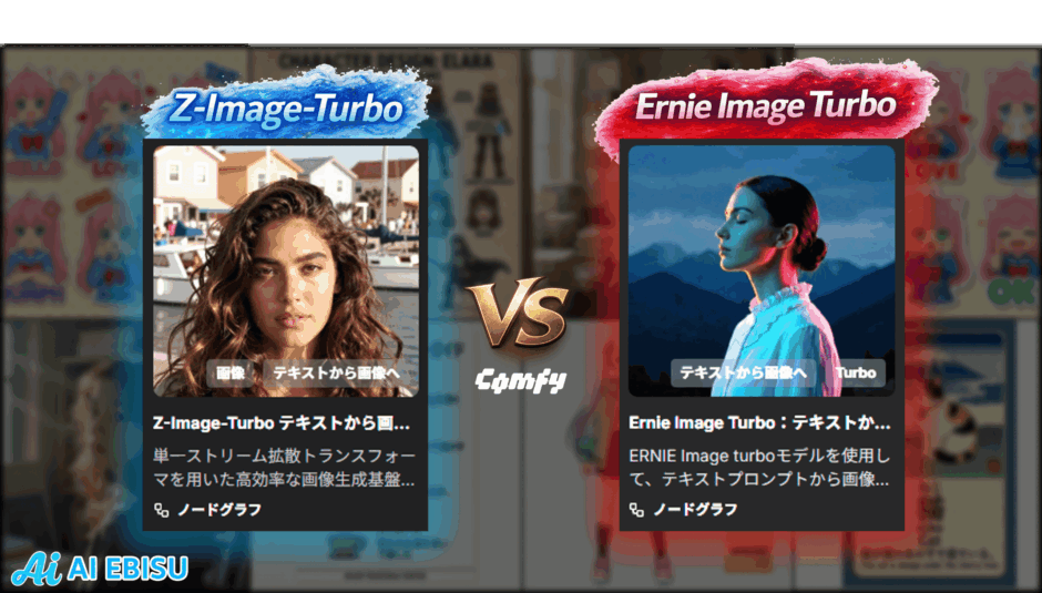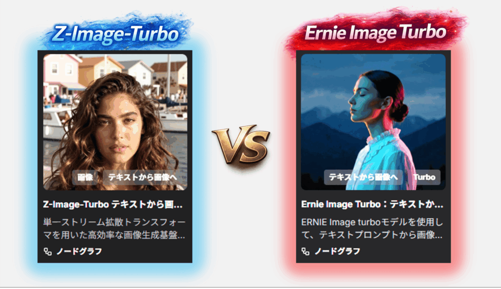 今回は、ComfyUIのテンプレートで用意されている「Z-image-Turbo」と「Ernie Image Turbo」のテキストから画像を生成するフローで性能比較をしてみます。