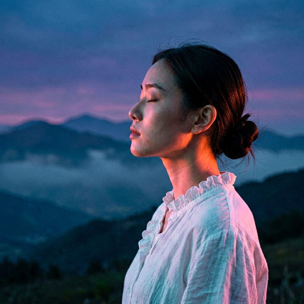 若い東アジア系の女性が肩越しに振り返っている。その表情は穏やかで、かすかな哀愁を帯びており、唇はわずかに開かれている。