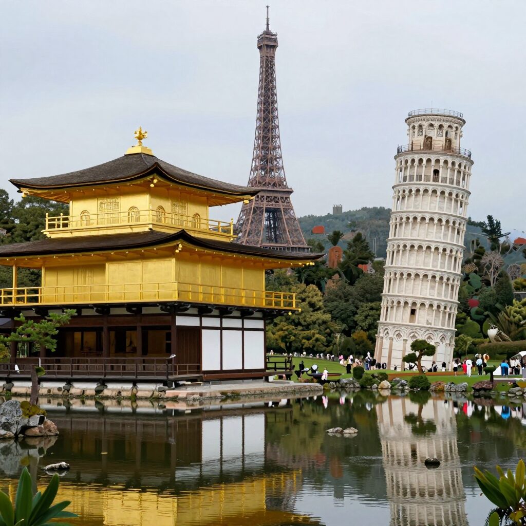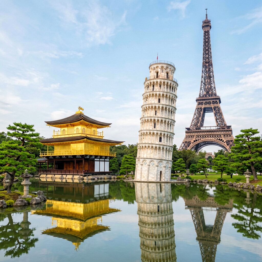 世界中の有名なランドマークを複数組み合わせたシーンを作成してください。