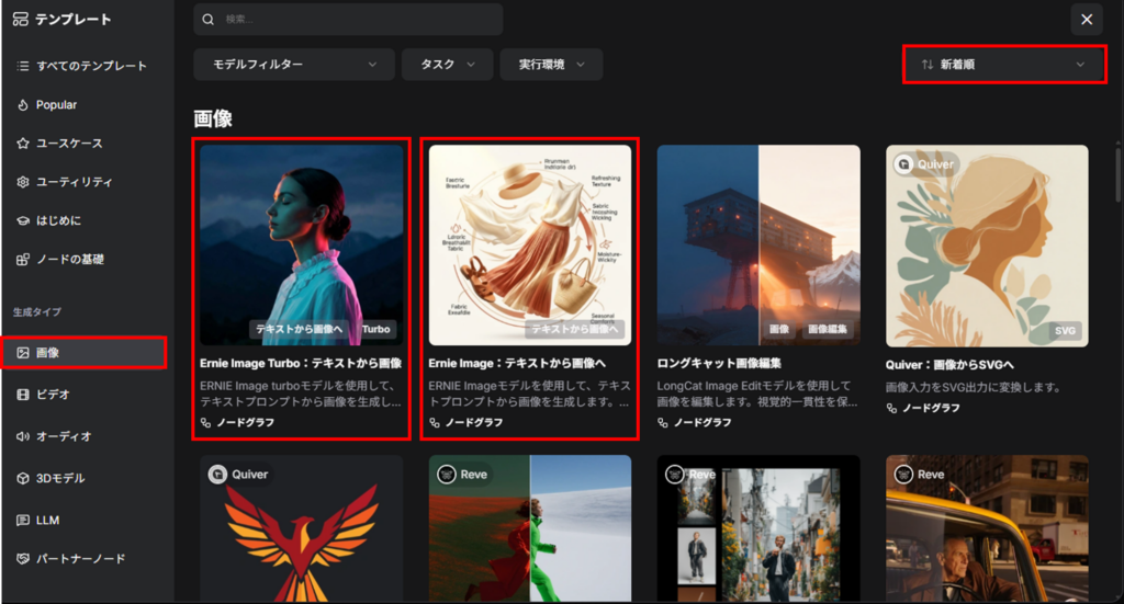 テンプレートから「生成タイプ:画像」「並び替え:新着順」で表示すると、Ernie Imageのテンプレートが追加されていることが確認できます。