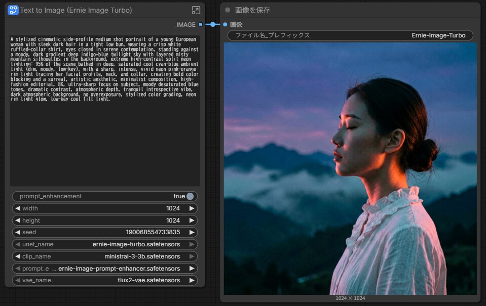 今回は「Ernie Image Turbo:テキストから画像」を使ってみたいと思います。